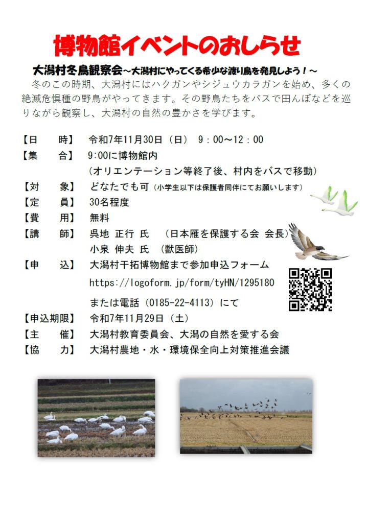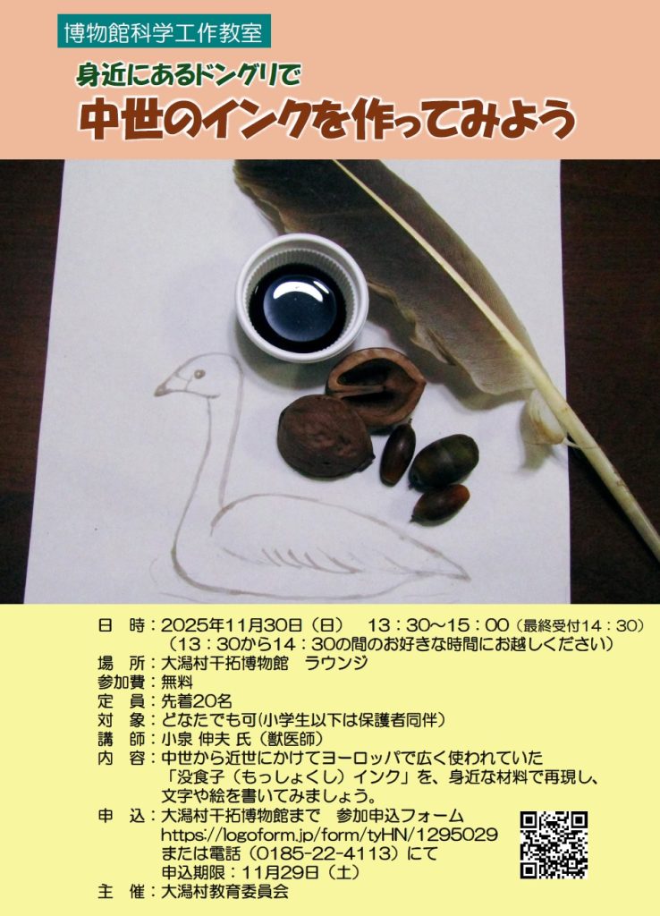 令和7年11月30日(日)【大潟村冬鳥観察会~大潟村にやってくる希少な渡り鳥を発見しよう!~】&【博物館科学工作教室 身近にあるドングリで中世のインクを作ってみよう】を開催いたします。