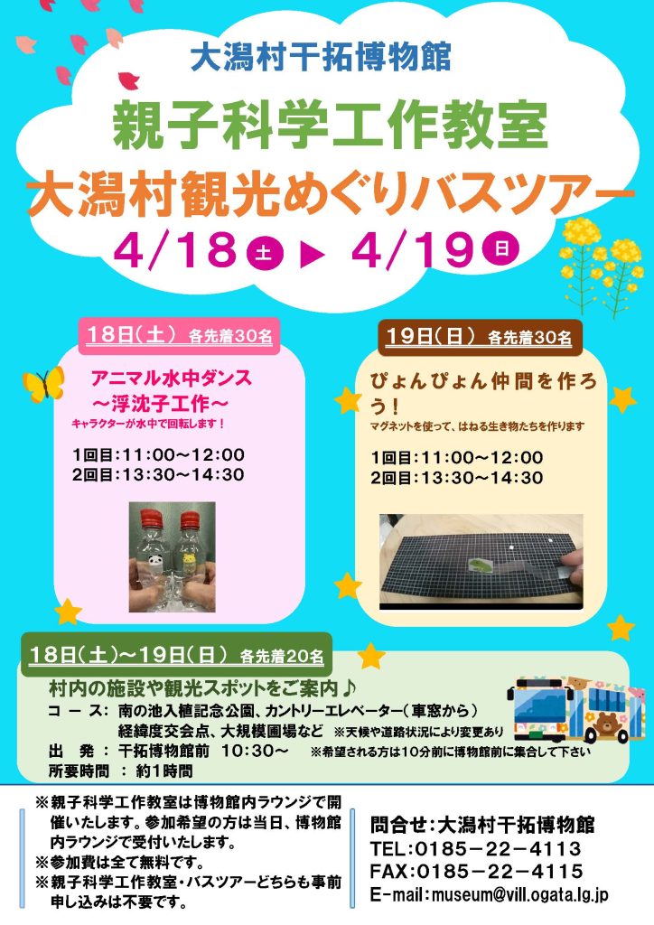 博物館イベントのおしらせ 干拓博物館では4/18(土)~4/19(日)の2日間 「親子科学工作教室」&「大潟村観光めぐりバスツアー」を開催いたします♪ 参加費全て無料!事前申し込みも必要ありません! たくさんの方のご参加お待ちしております☺ 一覧へ戻る